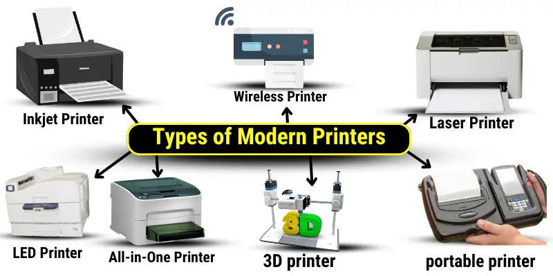 Modern printers include inkjet, laser, LED, 3D, all-in-one, wireless, and portable printers, each designed for specific tasks like high-quality photos, office documents, or 3D object creation.